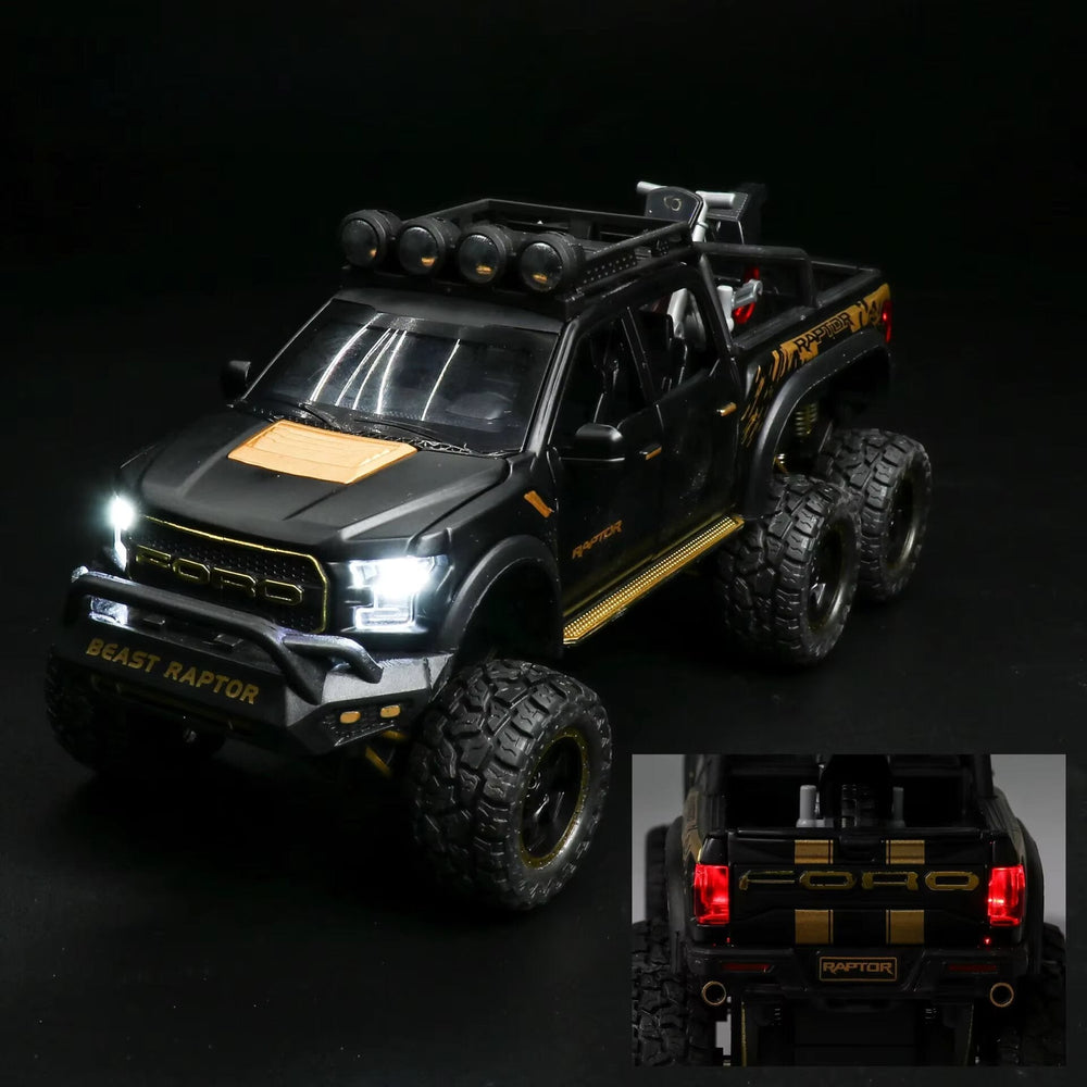 سيارة معدنية مصغرة بسحب للخلف، مع صوت المحرك والأضواء! استمتع بتجربة Ford Raptor F150 6X6 المصغرة مع محاكاة الحركة الواقعية: اضغط على العجلات الخلفية لتشغيل صوت المحرك والأضواء، اضغط على عجلة القيادة لإصدار صوت البوق، واسحب السيارة للخلف لتشاهدها تنطلق للأمام.